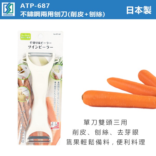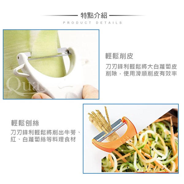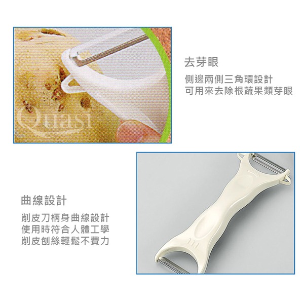 ●單刀雙頭三用,一頭削皮去芽眼 ●一頭刨絲,蔬果輕鬆備料,便利料理