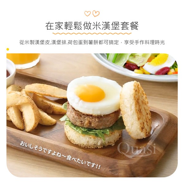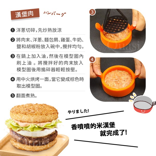 ●從米製漢堡皮.漢堡排.荷包蛋到薯餅都可搞定 ●在家輕鬆做出不輸專業的米漢堡套餐 ●享受親子手作料理時光