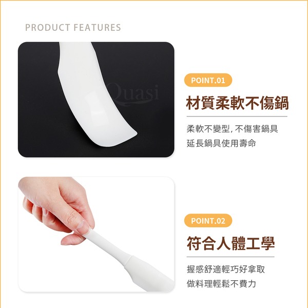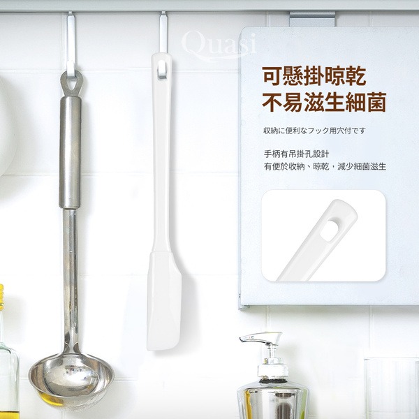 ●彈性耐熱矽膠刮匙,好拿握好施力,便捷翻炒食材 ●輕鬆刮淨瓶罐內醬料 ●吊孔握柄,可吊掛收納省空間 ●是料理不可或缺的單品