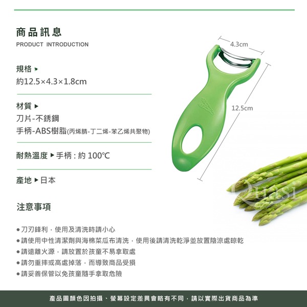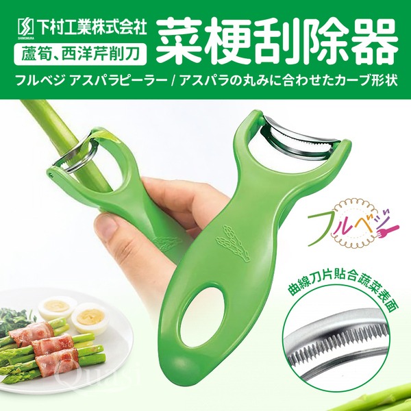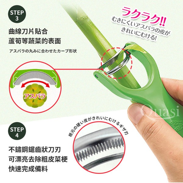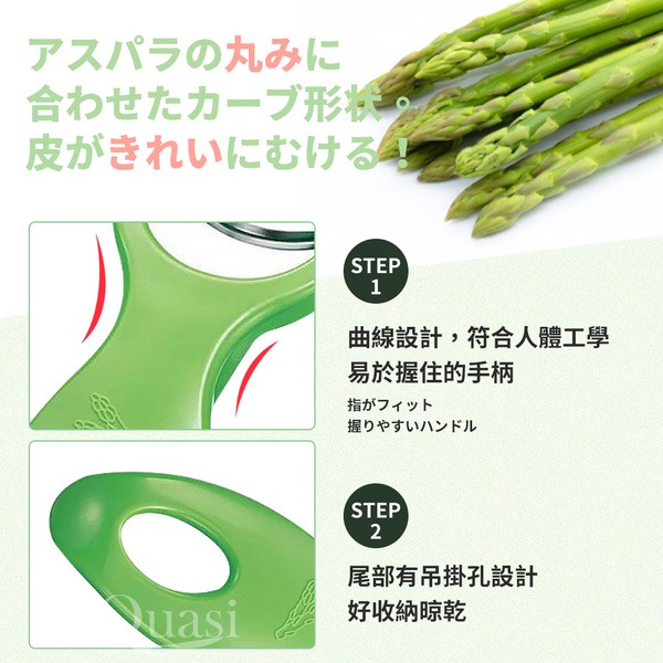 ●曲線刀片貼合蘆筍等蔬菜的表面 ●順暢一路滑下,漂亮去除粗皮菜梗 ●快速完成備料,調理好幫手