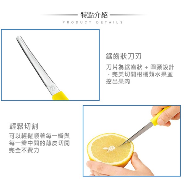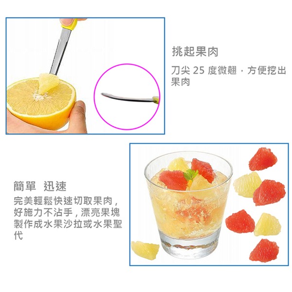 ● 完美切出葡萄柚果肉 ●使用420刃具級不鏽鋼材 ●簡單調理食物的小幫手