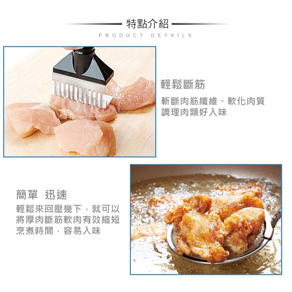 ●各式肉類的料理好幫手 ●可隔斷肉筋纖維,讓食材變成像高品質的肉一樣好入口 ●有效縮短烹煮時間,容易入味 ●手柄末端掛孔設計,方便懸掛收納