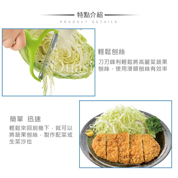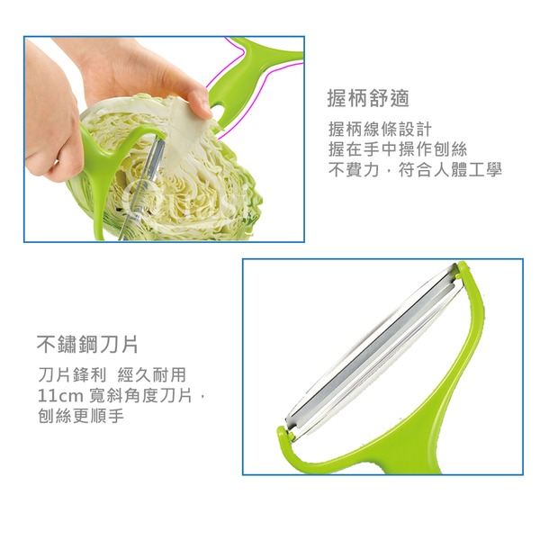 ●不用砧板即可刨出細長菜絲 ●刃具使用不鏽鋼材質 ●簡單調理食物的小幫手