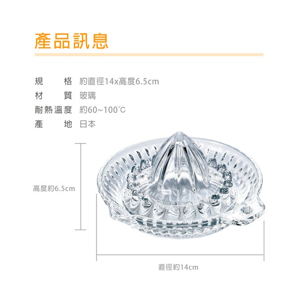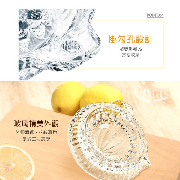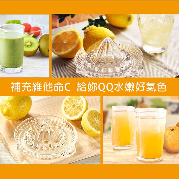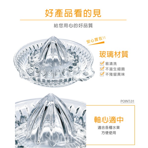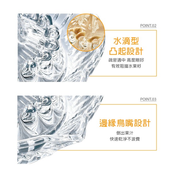 ●玻璃材質,易清洗,不滋生細菌,不殘留異味 ●易轉壓,輕鬆不費力 ●水滴型凸起設計,方便卡住水果籽 ●邊緣上凹槽設計,簡單倒出果汁