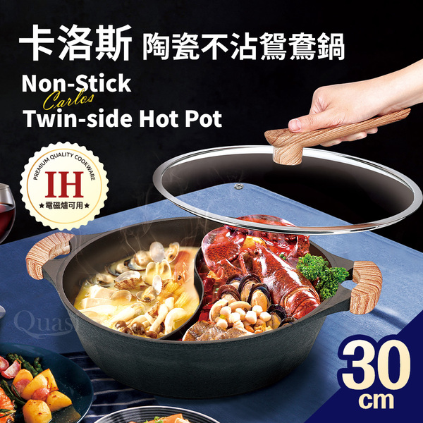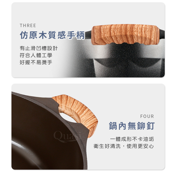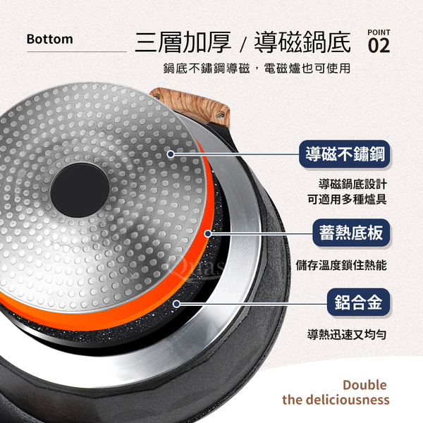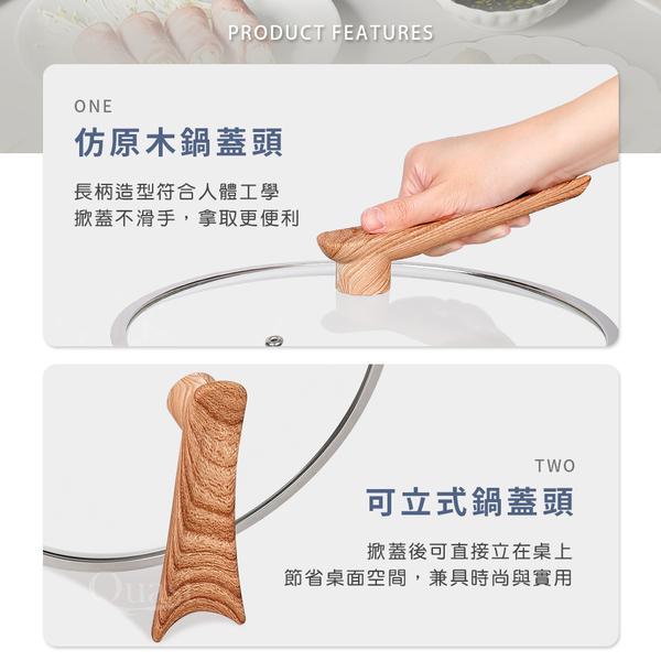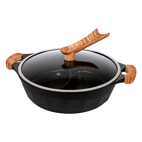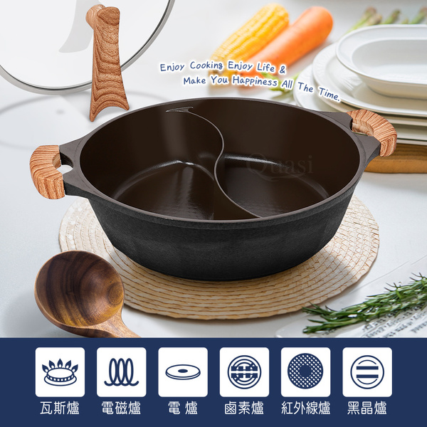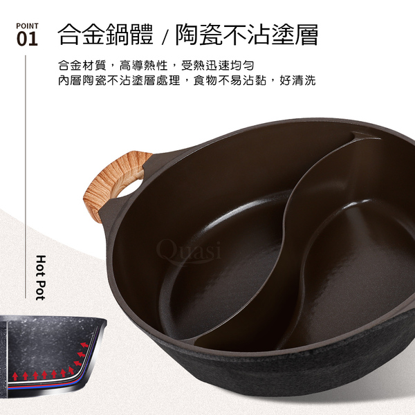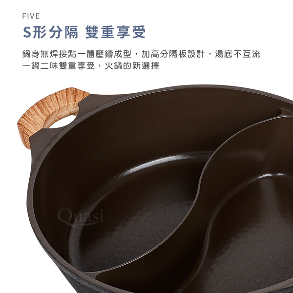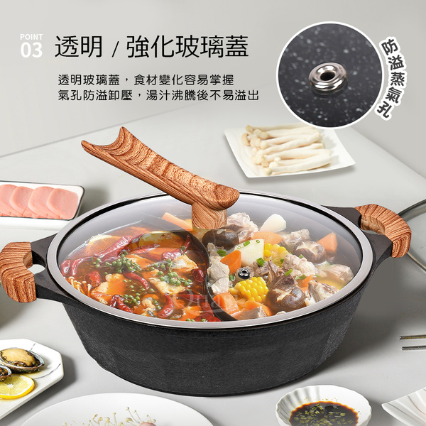 ●一鍋二味.S形分隔.雙重享受 ●鍋蓋可立.拿取便捷.節省桌面置物空間 ●仿原木質感鍋蓋柄.符合人體工學設計 ●鍋底不鏽鋼導磁.電磁爐也可使用