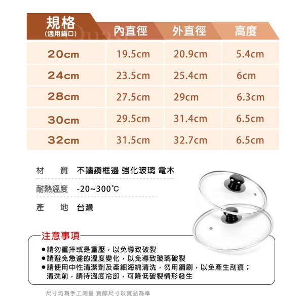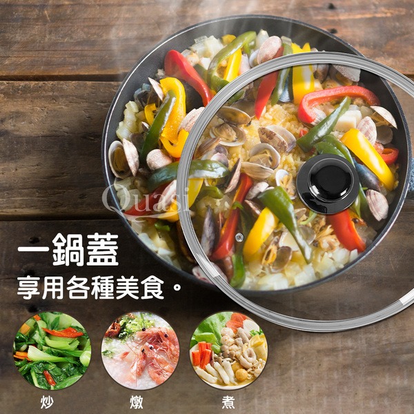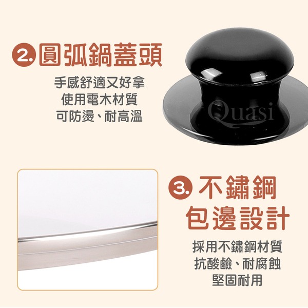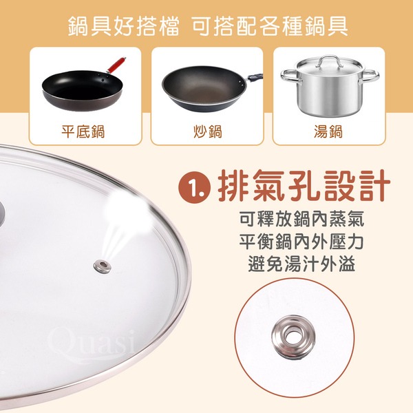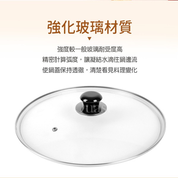●強化玻璃,耐高溫不變形 ●鍋蓋頭採用電木材質,隔熱防燙 ●框邊使用不鏽鋼包邊 ●氣孔設計,可控制鍋內氣壓
