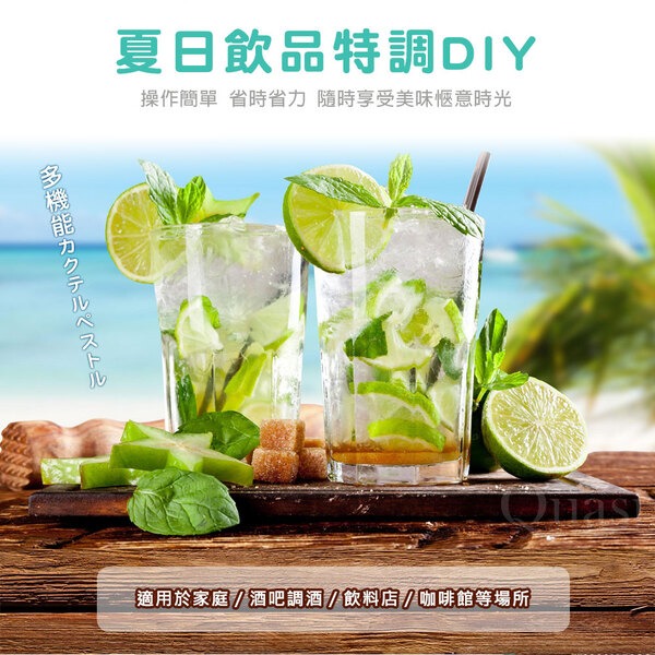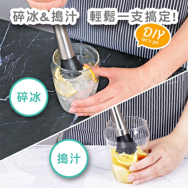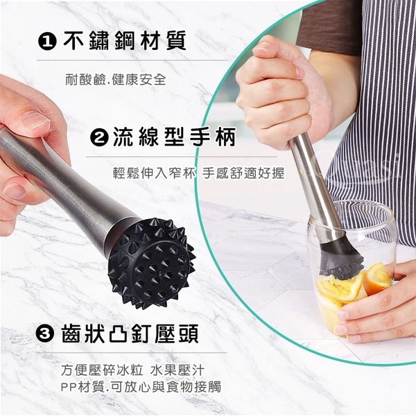 ●堅固耐用不鏽鋼材質.流線型手柄 ●可輕鬆伸入窄杯.齒狀凸釘壓頭 ●便於壓碎冰粒及水果壓汁.在家就能享受調配飲品的樂趣
