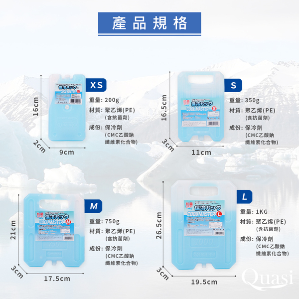 規格:約16×9×2cm-200g 規格:約16.5×11.0×3cm-350g 規格:約21×17.5×3cm-750g 規格:約26.5×19.5×3cm-1000g 材質:聚乙烯(PE)(含抗菌劑) 成份:保冷劑(CMC乙酸鈉纖維素化合物) 產地:日本