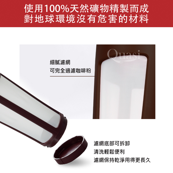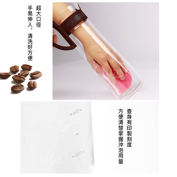●細膩濾網,可以過濾咖啡粉 ●濾網底部可以拆開清洗 ●壺身苗條,可放入冰箱門空間 ●拿掉濾網後,可以當泡茶、喝果汁的一般玻璃壺使用