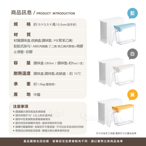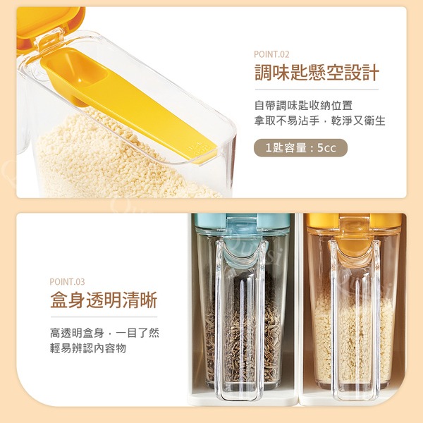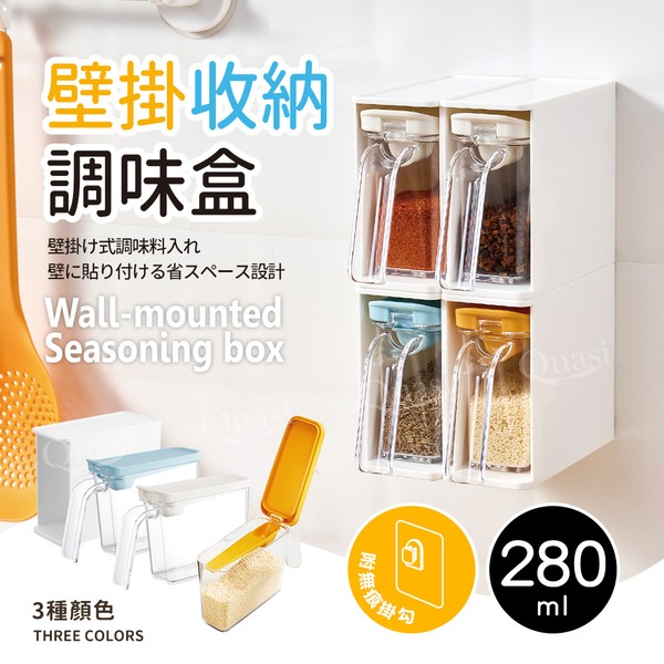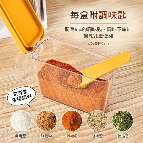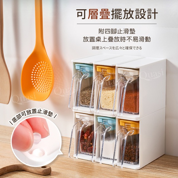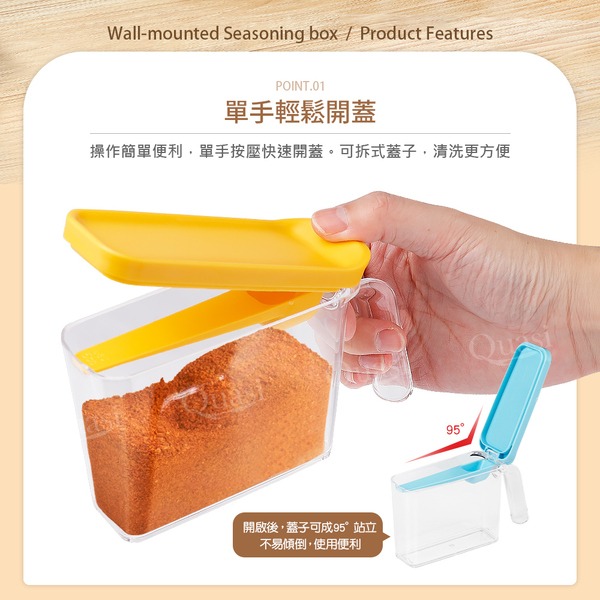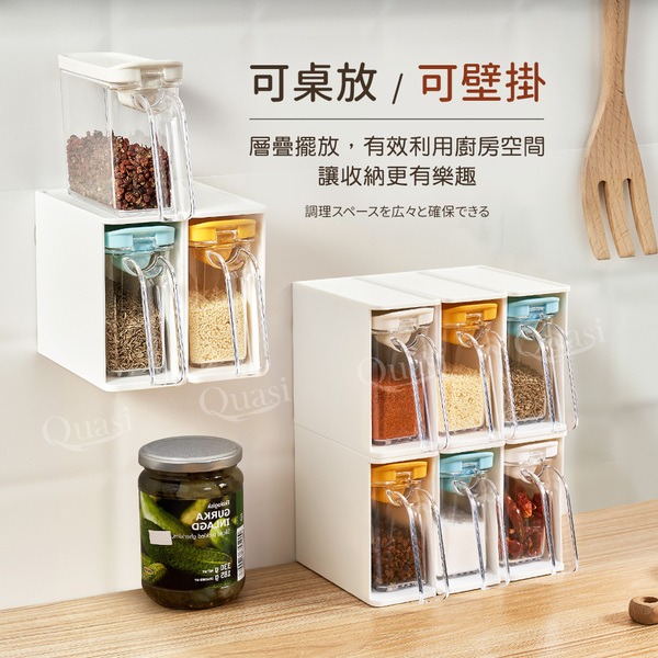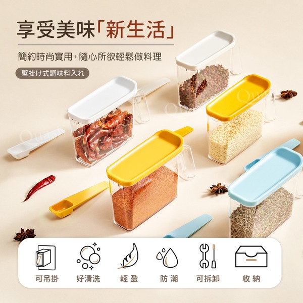 ●可桌放又可壁掛,層疊擺放,有效利用廚房空間 ●多種顏色可區分調味料,井然有序 ●單手開蓋設計,附調味匙懸放盒內好貼心 ●簡約時尚兼具實用,烹飪調味的好工具。