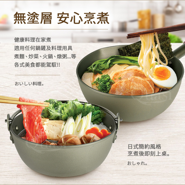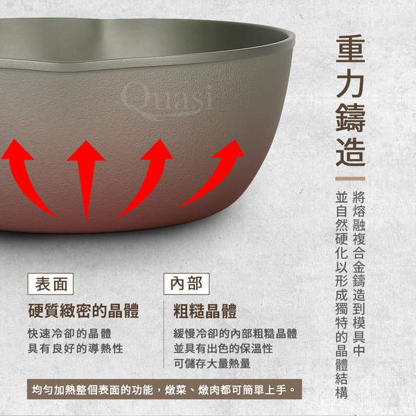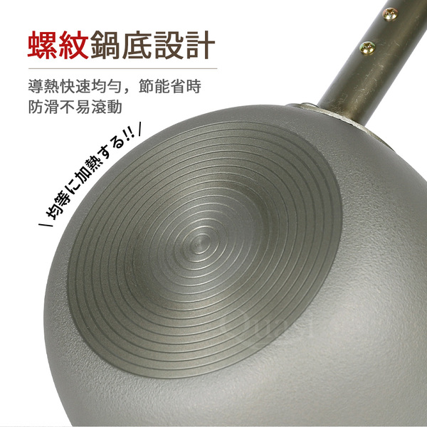●無塗層 適用任何鍋鏟 ●陽極處理表面比不鏽鋼硬,抗刮耐磨 ●高級複合金材質,螺紋鍋底,傳熱快速又均勻