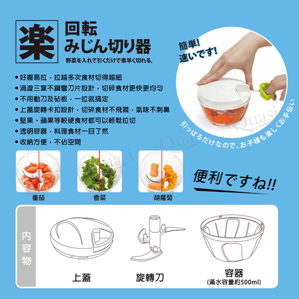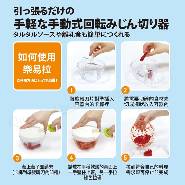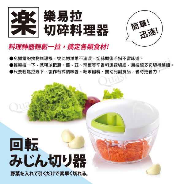 ●收納方便,不佔空間 ●好握易拉,拉愈多次切得愈細 ●附攪拌棒,可攪拌蛋液、麵糊、醬 ●透明容器,料理食材一目了然