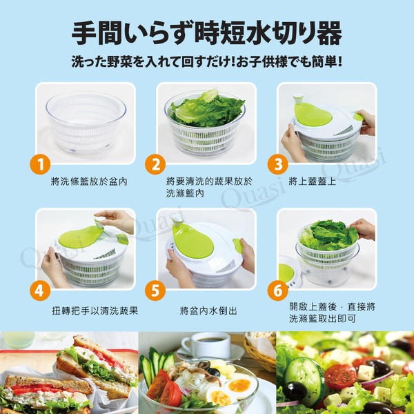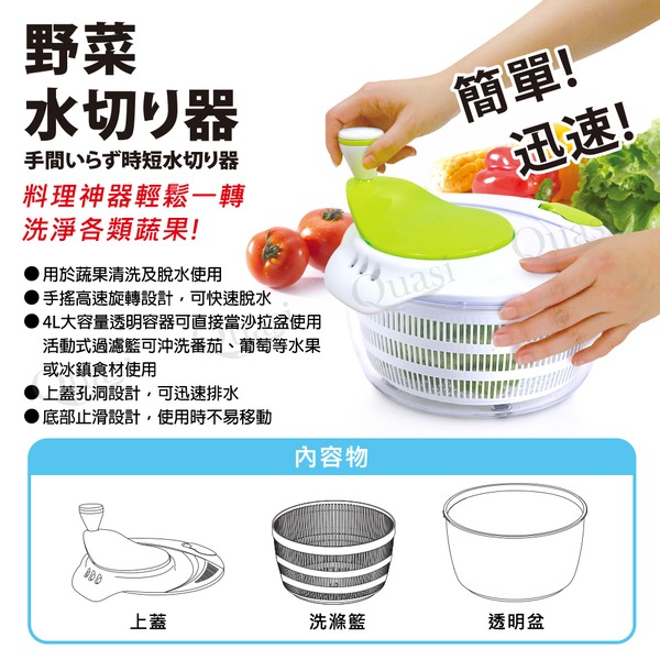 ●手搖高速旋轉設計,可快速脫水 ●4L大容量透明盆設計,可直接當 ●收納方便,不佔空間