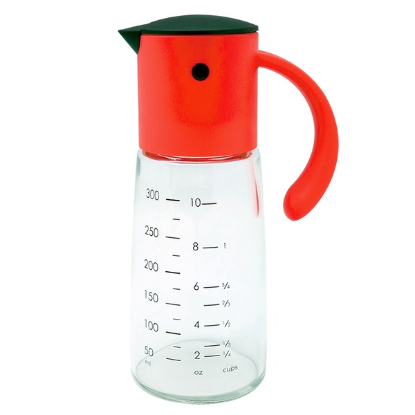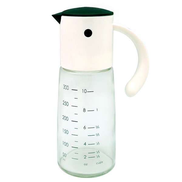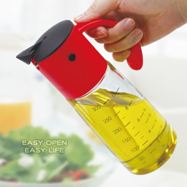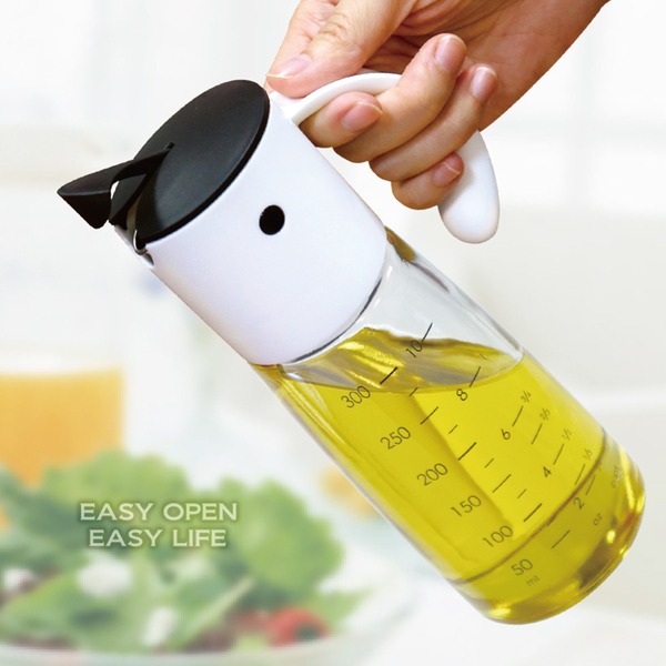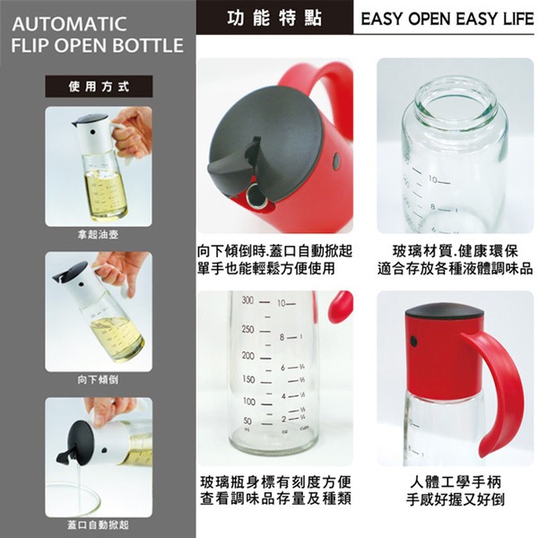 ●向下傾倒時.蓋口自動掀起單手也能輕鬆方便使用 ●玻璃材質.健康環保適合存放各種液體調味品 ●玻璃瓶身標有刻度方便查看調味品存量及種類 ●人體工學手柄手感好握又好倒