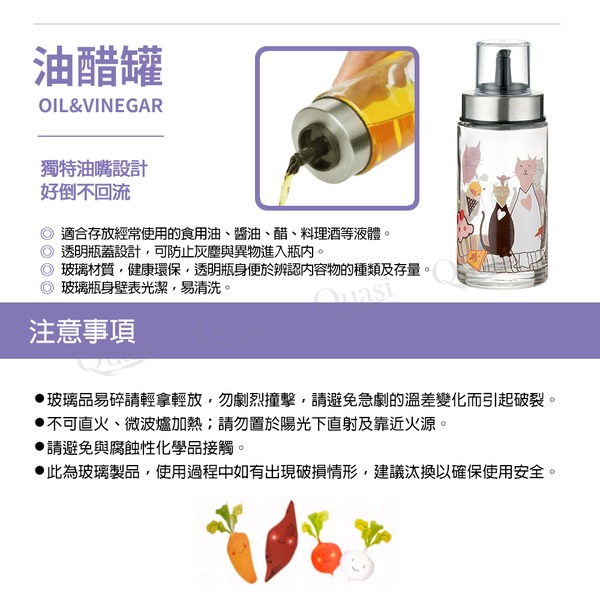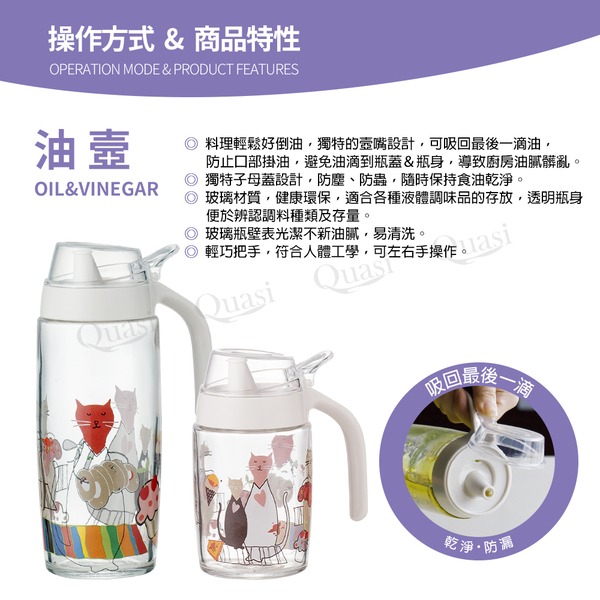 ●玻璃材質,健康環保,易清洗 ●明瓶身便於辨認內容物的種類及存量 ●料理輕鬆好倒油,獨特的壺嘴設計 ●可放在廚房、餐桌、烤肉時,隨取隨用很便利