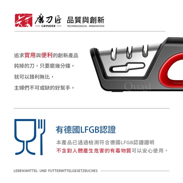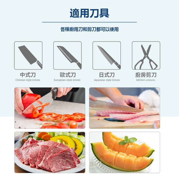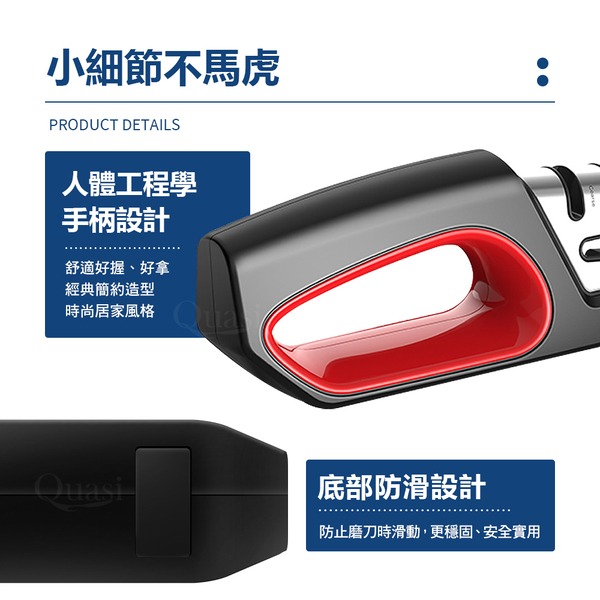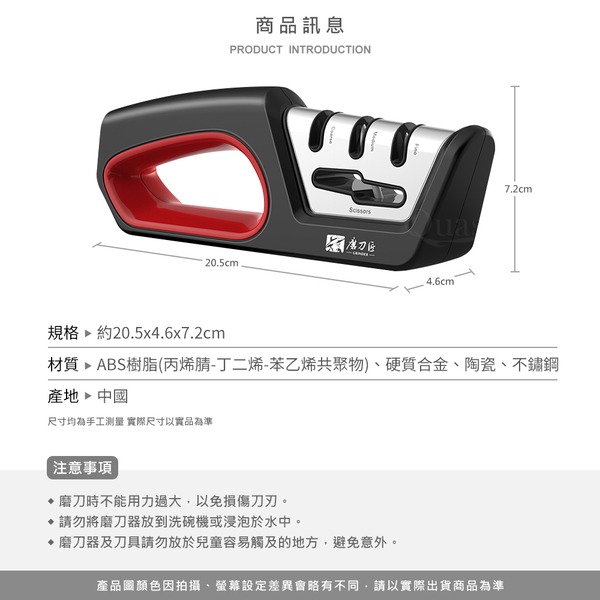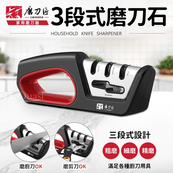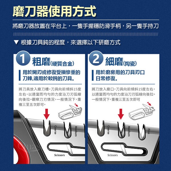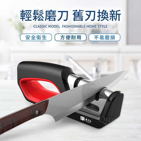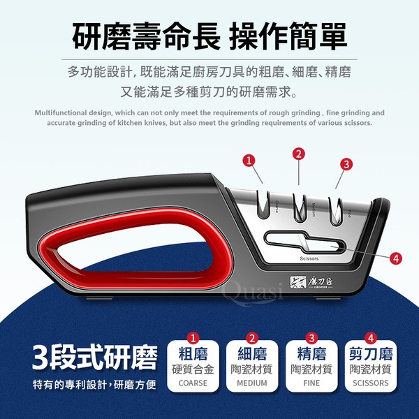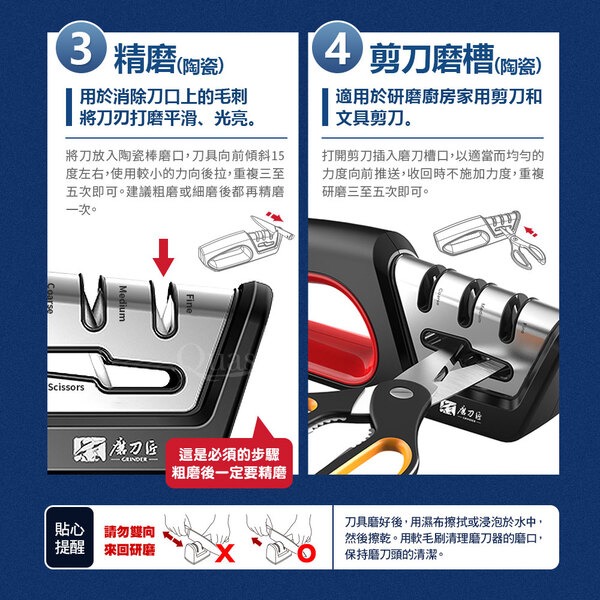 ●多功能設計,既能滿足廚房刀具的粗磨、細磨、精磨 ●滿足多種剪刀的研磨需求 ●底部防滑設計 ●人體工學軟手柄設計,安全舒適