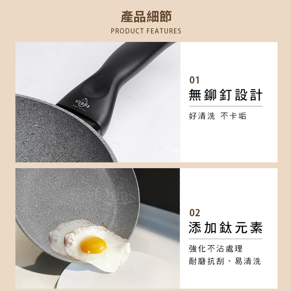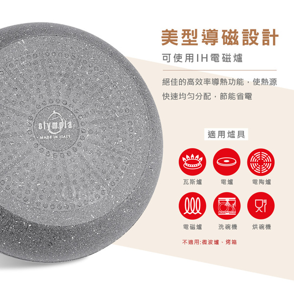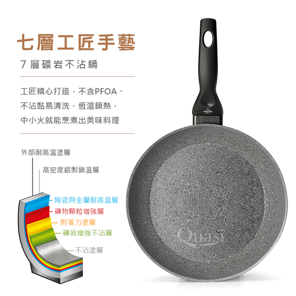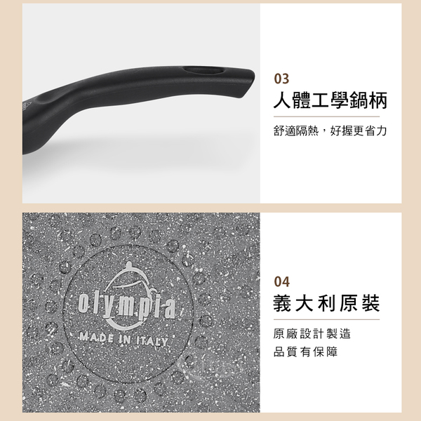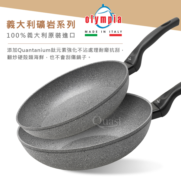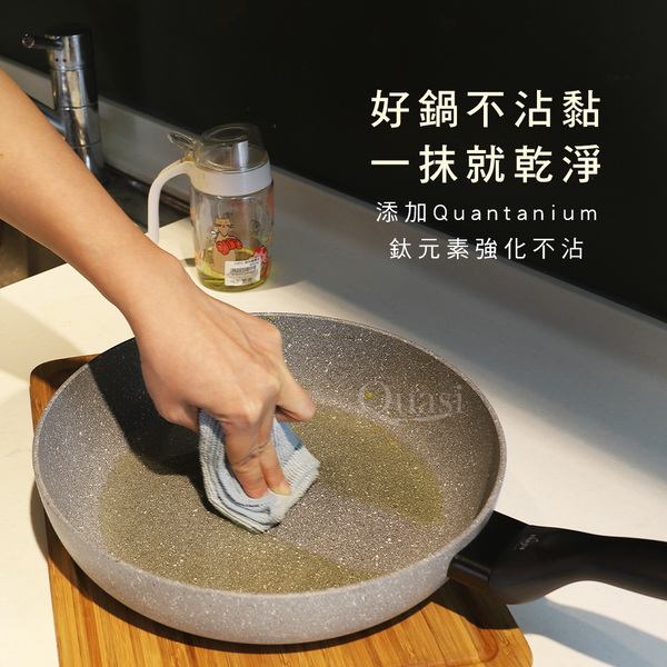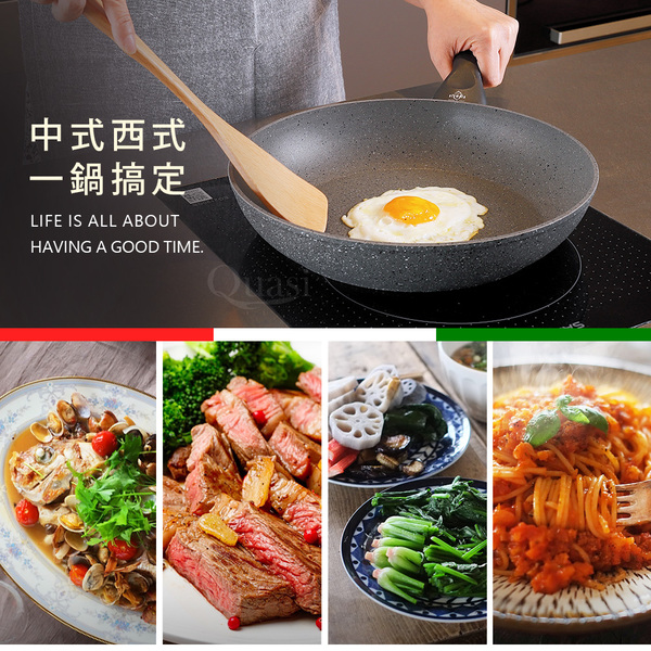 ●100%義大利製造進口 ●底部美型導磁設計,絕佳的高效率導熱功能 ●新一代Quantanium鈦元素強化不沾處理, 更耐磨抗刮 ●符合少油輕食的健康概念