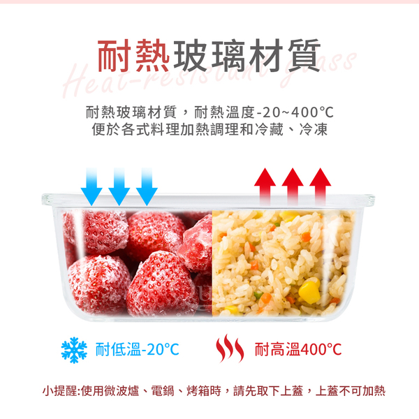 規格:約13.7×13.7×6.3cm-400ml 規格:約15.6×15.6×7cm-650ml 規格:約17.9×17.9×7.6cm-950ml 材質:本體-耐熱玻璃 / 上蓋-聚丙烯.矽膠條 耐熱溫度:本體:-20~400℃ / 上蓋:-20~100℃