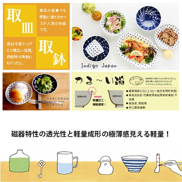 ●日本波佐見Indigo Japan藍丸紋系列 ●輕量化比一般陶瓷更輕,白藍純粹 ●水玉設計,餐桌上帶入日式和風簡約風格 ●盛裝.餐具.保存全方位3合1,便於料理存放