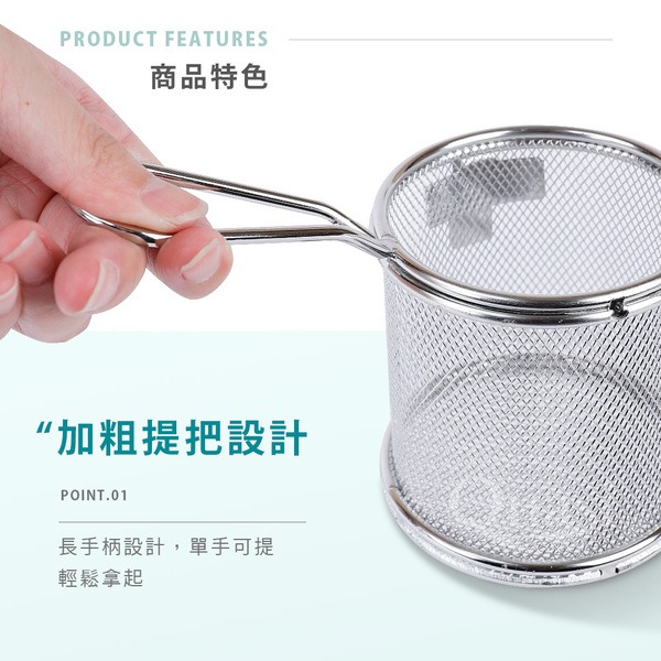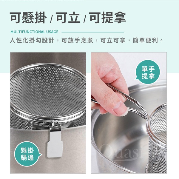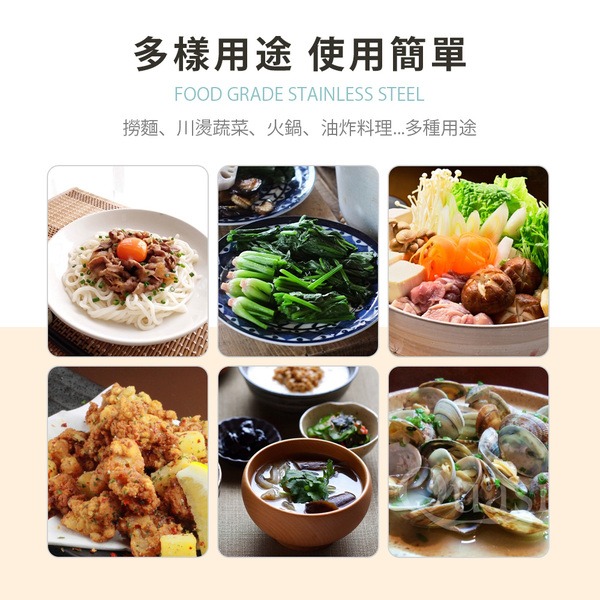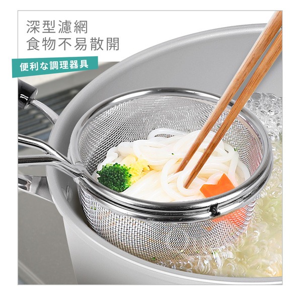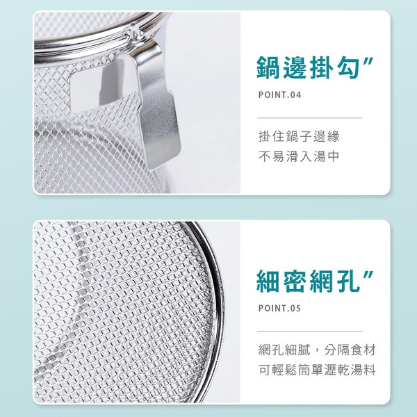 ●同時煮主食及配料的食材,省時不費力,分隔食材不亂跑 ●鍋邊勾設計,掛住邊緣不易滑入湯中 ●提把設計,輕鬆撈取且瀝乾湯料 ●烹煮食材享受鍋物