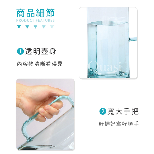 ●壺身透明,內容物看得見 ●寬大手把,好握好拿 ●壺蓋凹槽設計,輕盈好拿取 ●繽紛顏色,不怕拿錯杯子