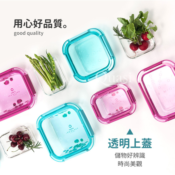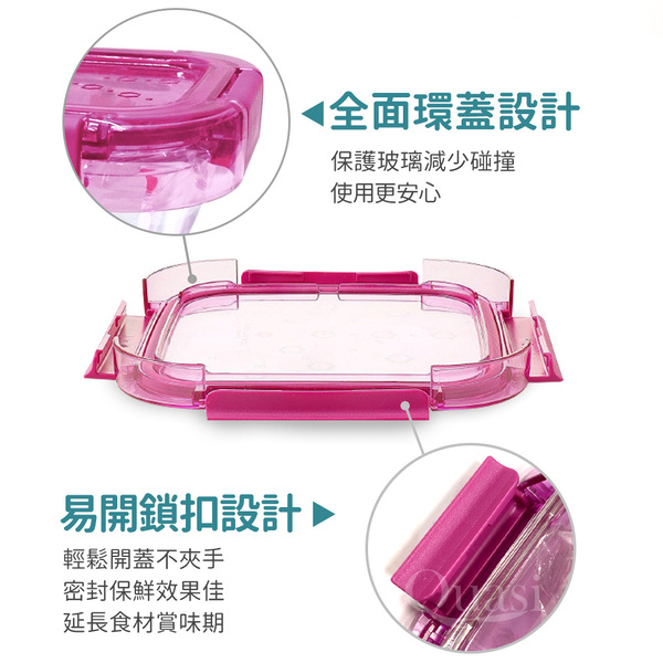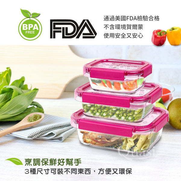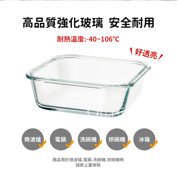 規格:約15×11.7x6cm-385ml 規格:約19×14.3×6.7cm-820ml 規格:約19×14.3×6.7cm-1220ml 材質:容器-強化玻璃,上蓋-聚丙烯,密封條-矽膠 耐熱溫度:容器-40~106℃ 上蓋:-20~100℃ 產地:玻璃-杜拜/上蓋-韓國