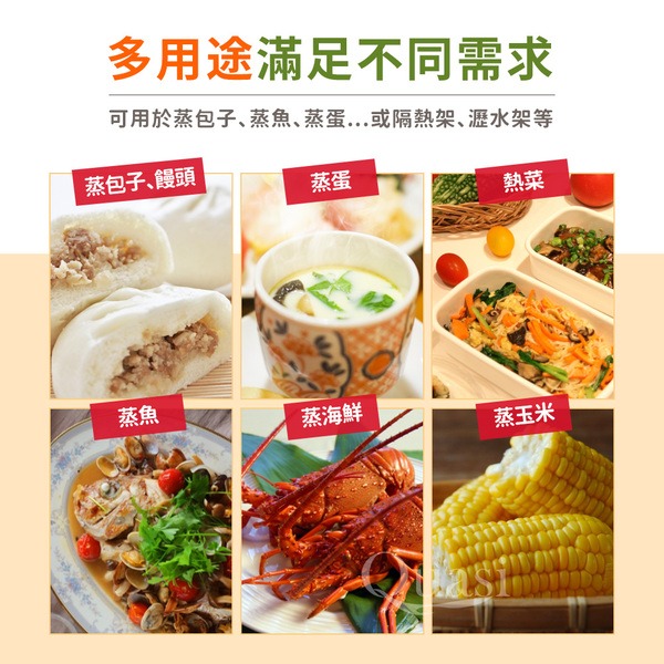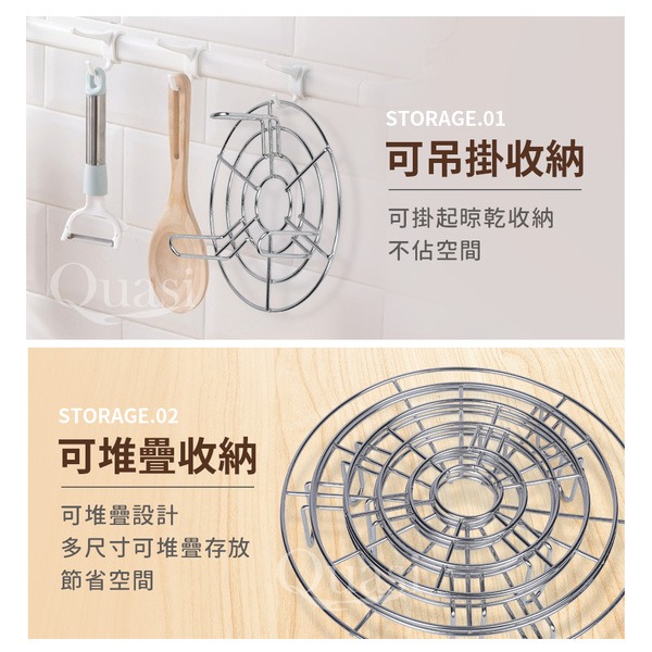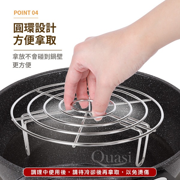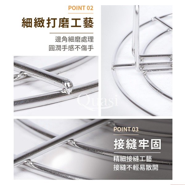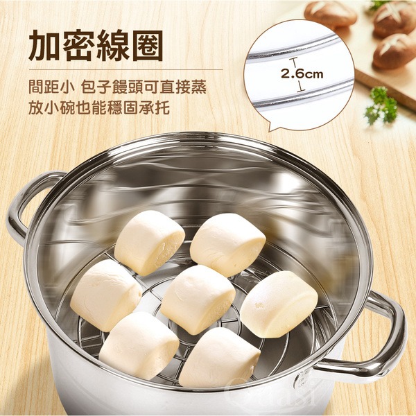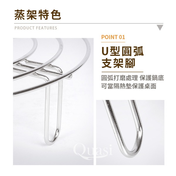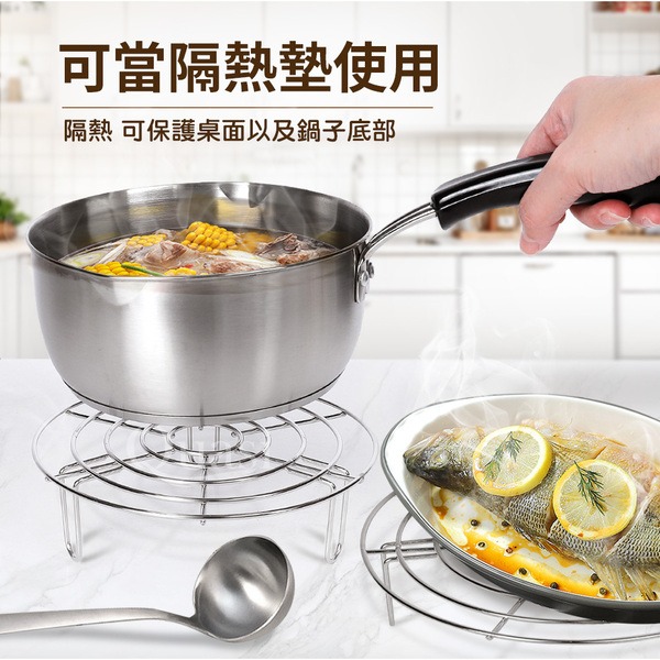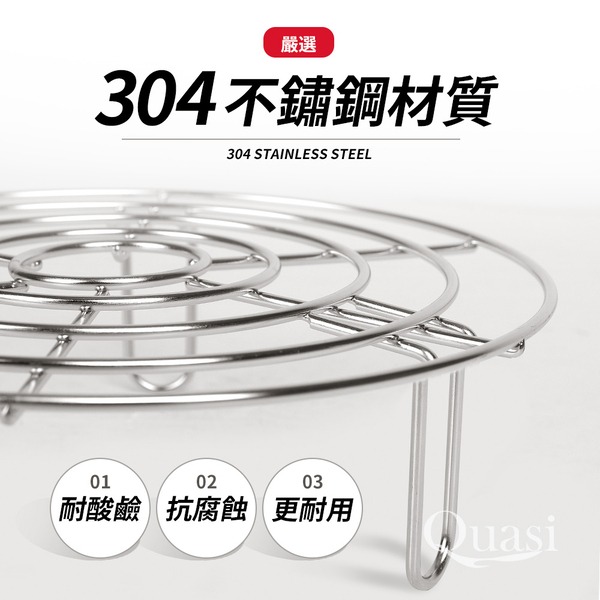 ●不鏽鋼材質.耐酸鹼.更經久耐用 ●邊角細磨處理.圓潤手感不傷手 ●加密線圈.包子饅頭可直接蒸.間距小.放小碗也能穩固承托 ●U型圓弧支架腳.保護鍋底.也可當隔熱墊保護桌面