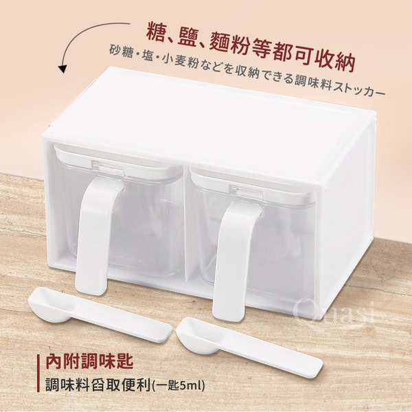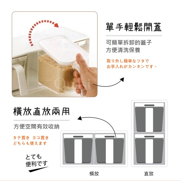 ●單手輕鬆開蓋;內附調味匙,調味料舀取便利 ●透明盒設計,調味料內容存量,一清二楚 ●橫直兩用,上層另可置其他調味品,空間有效收納