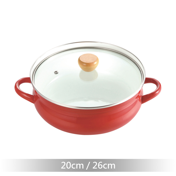 規格:約27.5×20×11cm,2.1L-20cm 規格:約34.5×26×13.5cm,4.5L-26cm 材質:本體-鋼板(琺瑯加工)/鍋蓋-不鏽鋼,強化玻璃,天然木