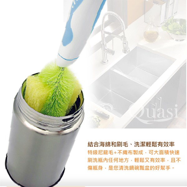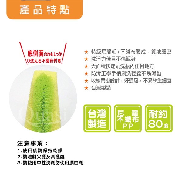 ●特級尼龍毛+不織布製成 ●質地細密易刷洗瓶內任何地方 ●洗淨力佳且不傷瓶身 ●防滑工學手柄刷洗輕鬆不易滑動