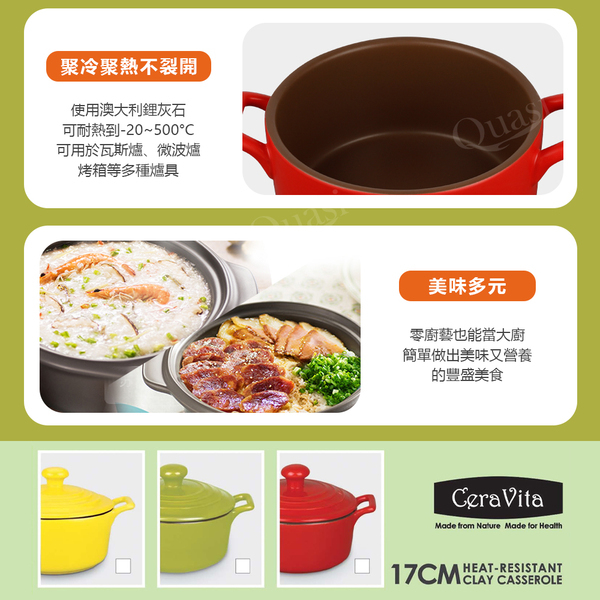 ●天然炊具、保留食物自然鮮美原味 ●純天然高嶺土,抗菌耐磨釉面層 ●耐溫可達-20℃~500℃ ●受熱均勻,保溫力持久