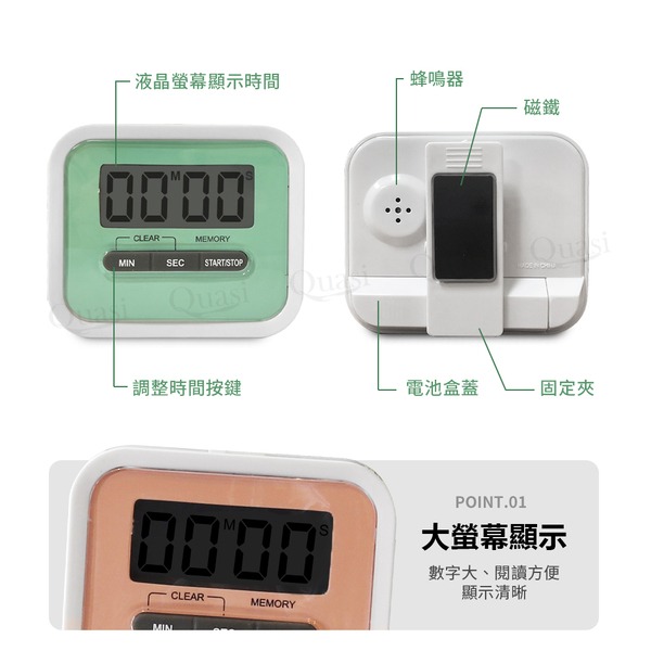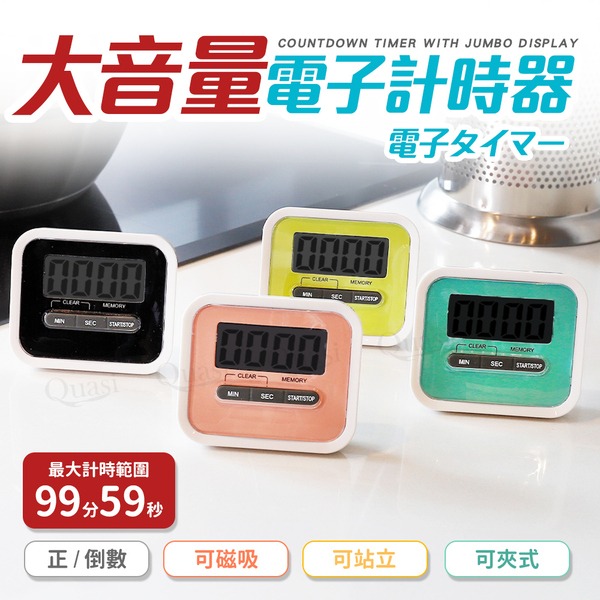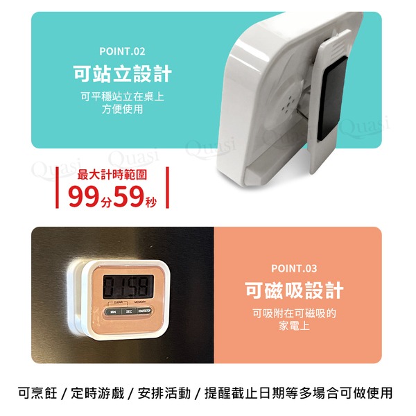 ●大數字螢幕清晰顯示 ●附支架及磁鐵.可站立也可吸掛 ●烹飪、定時游戲、安排活動、提醒截止日期等多場合可做使用