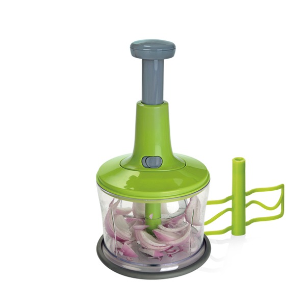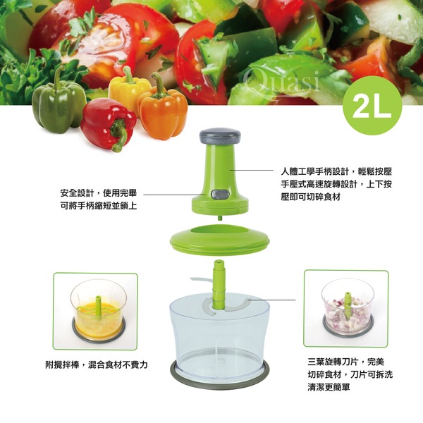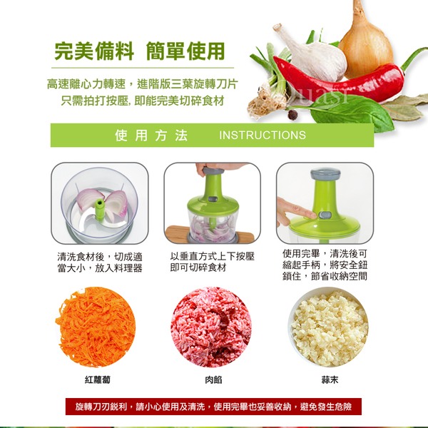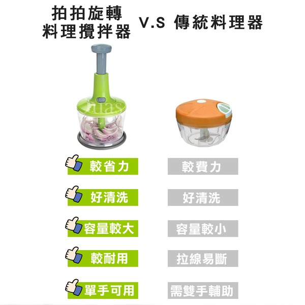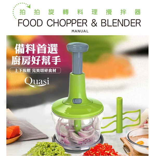 ●高速離心力轉速,三葉旋轉刀片 ●只需拍打按壓,即能完美切碎食材 ●並加附攪拌棒,混合食材不費力