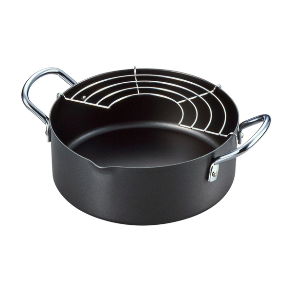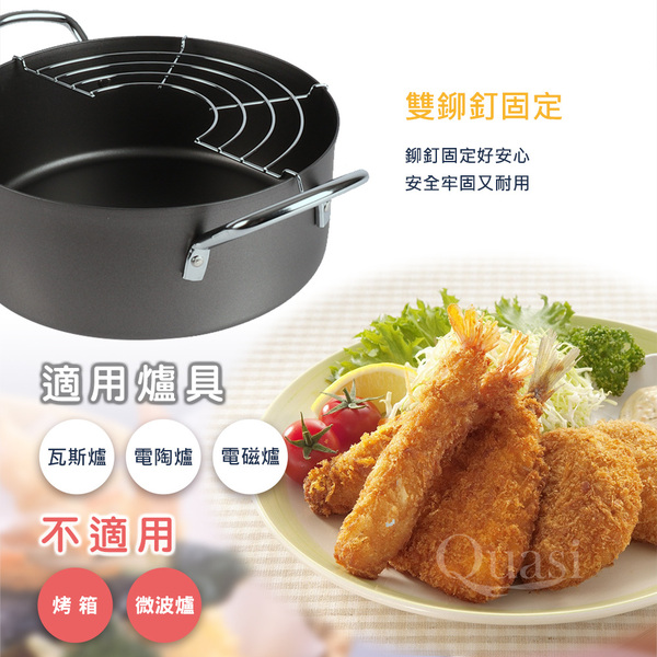 規格:約20.8×27.5×9.5cm,2.3L(滿水量),1.3L(適油量) 材質:本體/把手-鐵 (不沾黏表面塗層),網-鐵(鍍鉻表面) 產地:日本