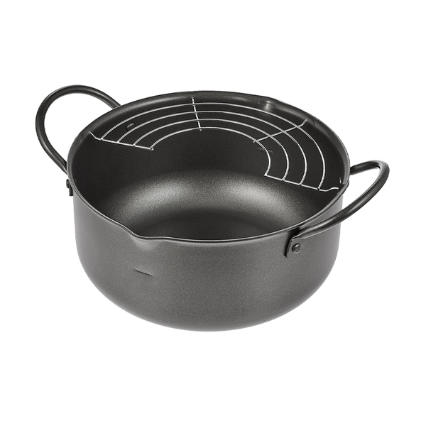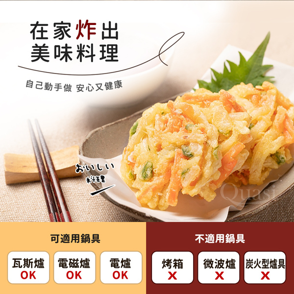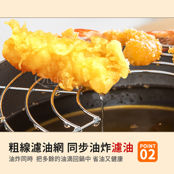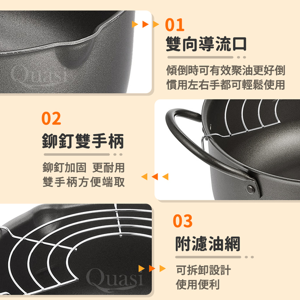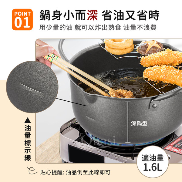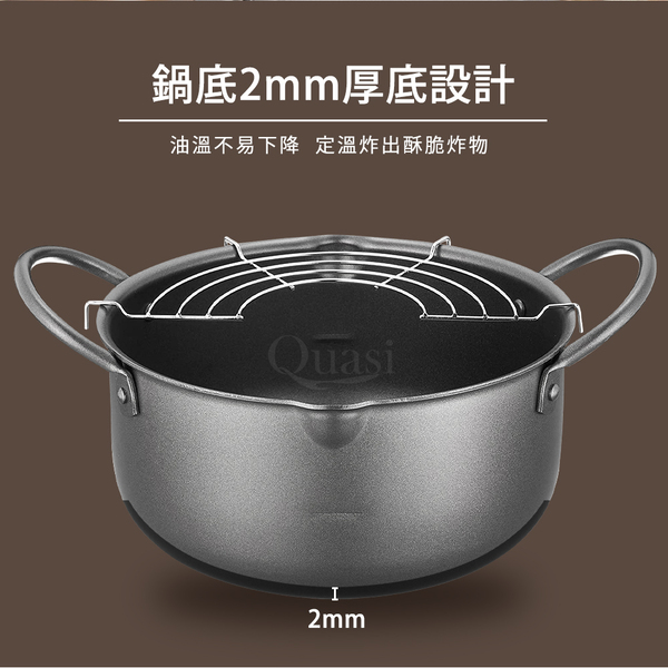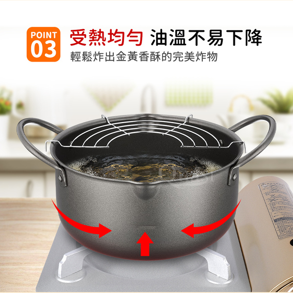 ●2mm厚底設計,導熱快油溫不易下降,定溫炸出酥脆 ●深型鍋,油炸不擔心噴油,可安心烹調 ●附粗線網設計,方便放置剛炸好的食材瀝油好方便 ●特殊邊嘴設計,讓倒油更方便