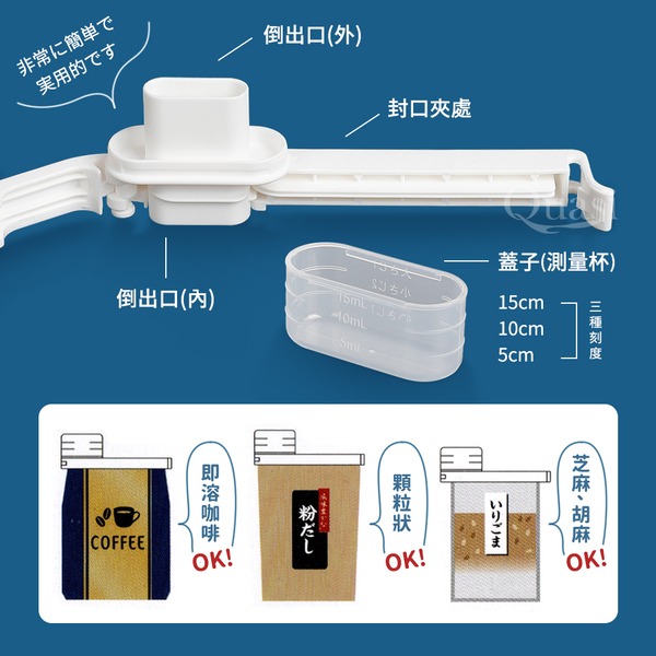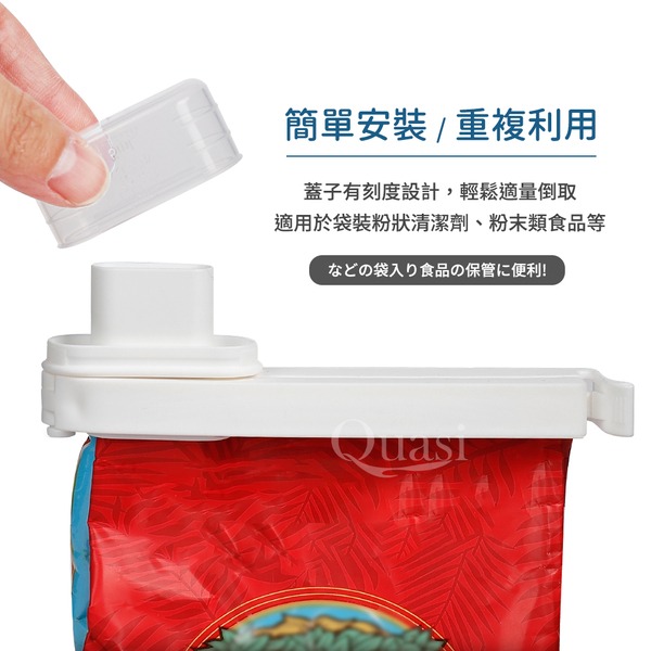 ●簡單安裝,重複利用 ●掀蓋設計,輕鬆適量倒取 ●適用於袋裝粉狀清潔劑、粉末類食品等