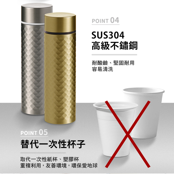 ●SUS304不鏽鋼耐酸鹼.堅固耐用.容易清洗 ●鑽石切割面.質感優雅.好握且兼具防滑功能 ●超輕量.隨身攜帶方便.可放入口袋、隨身小包 ●出門在外可重複使用.替代一次性環保紙杯