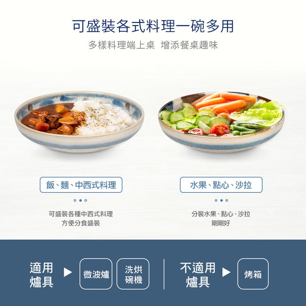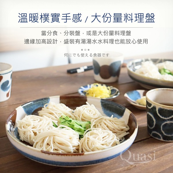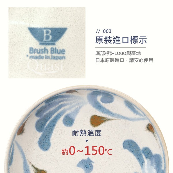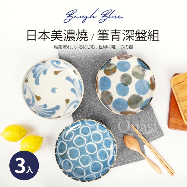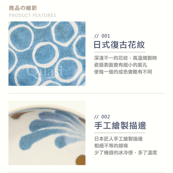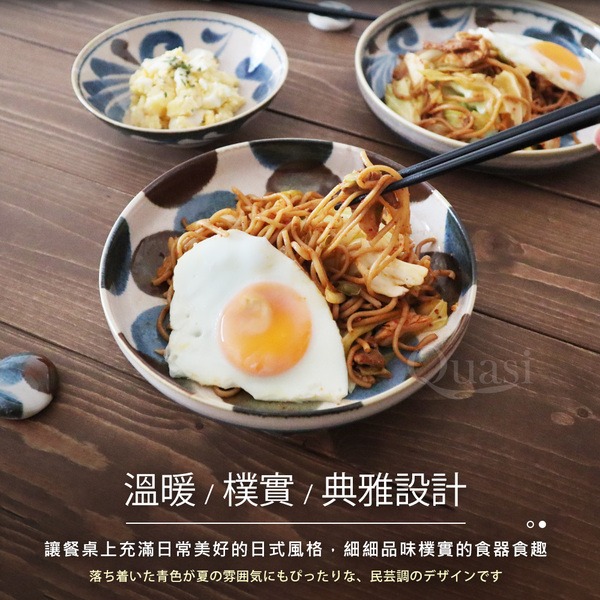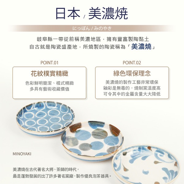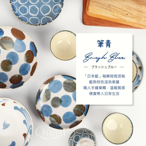 ●日本名陶之一,岐阜美濃燒 ●「日本藍」釉藥微微流釉,藍與棕色渲染漸層 ●職人手繪筆觸,溫暖質感,樸實帶入日常生活