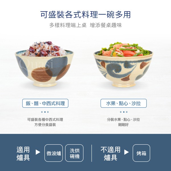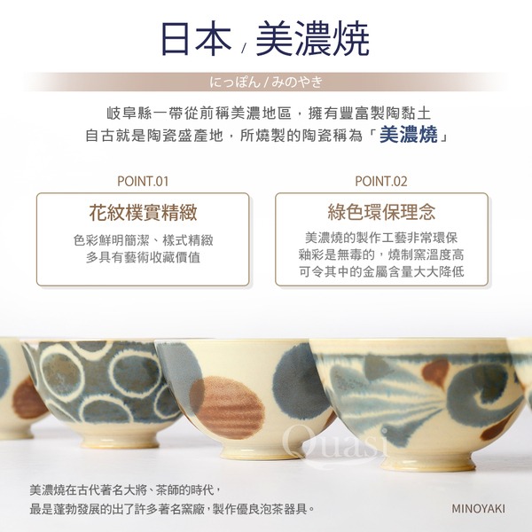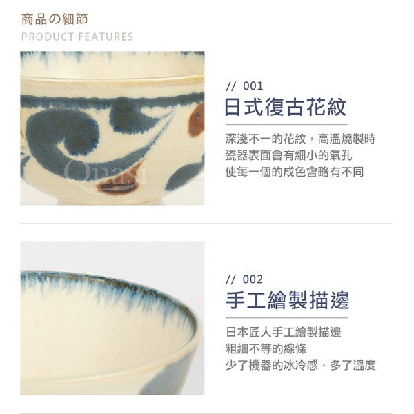 ●日本名陶之一,岐阜美濃燒 ●「日本藍」釉藥微微流釉,藍與棕色渲染漸層 ●職人手繪筆觸,溫暖質感,樸實帶入日常生活