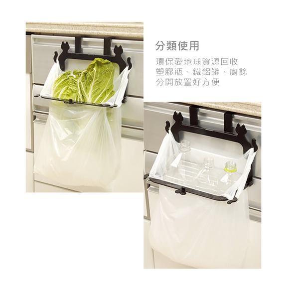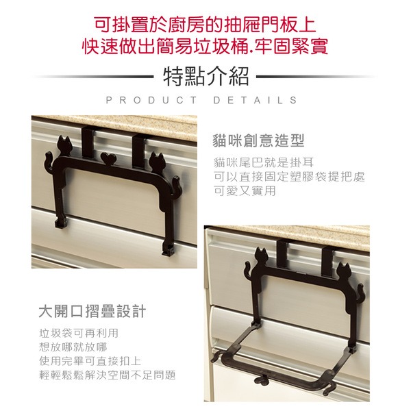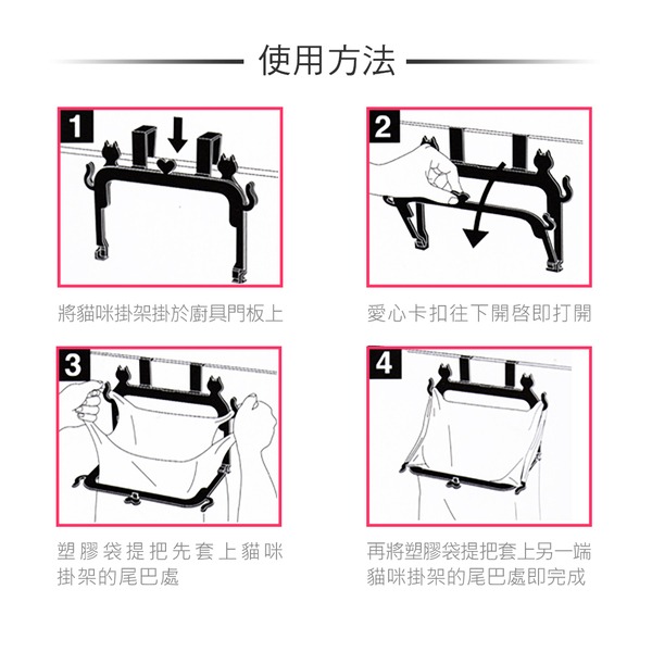 ●塑膠袋雙耳掛上,快速做出簡易垃圾桶, ●牢固緊實,貓咪造型創意輕巧,好收不佔空間