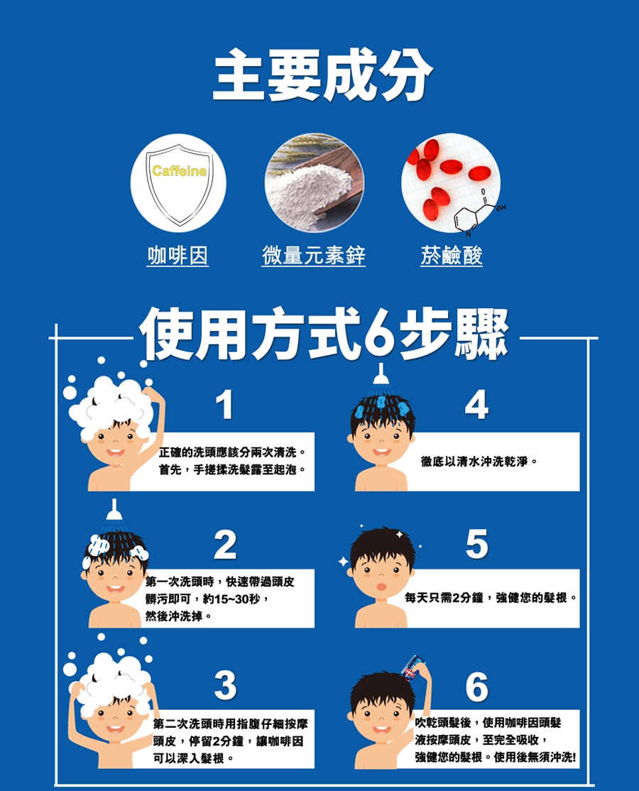 取適量加水產生泡沫,讓泡沫停留在頭上2分鐘,再以清水洗淨,適合天天使用。