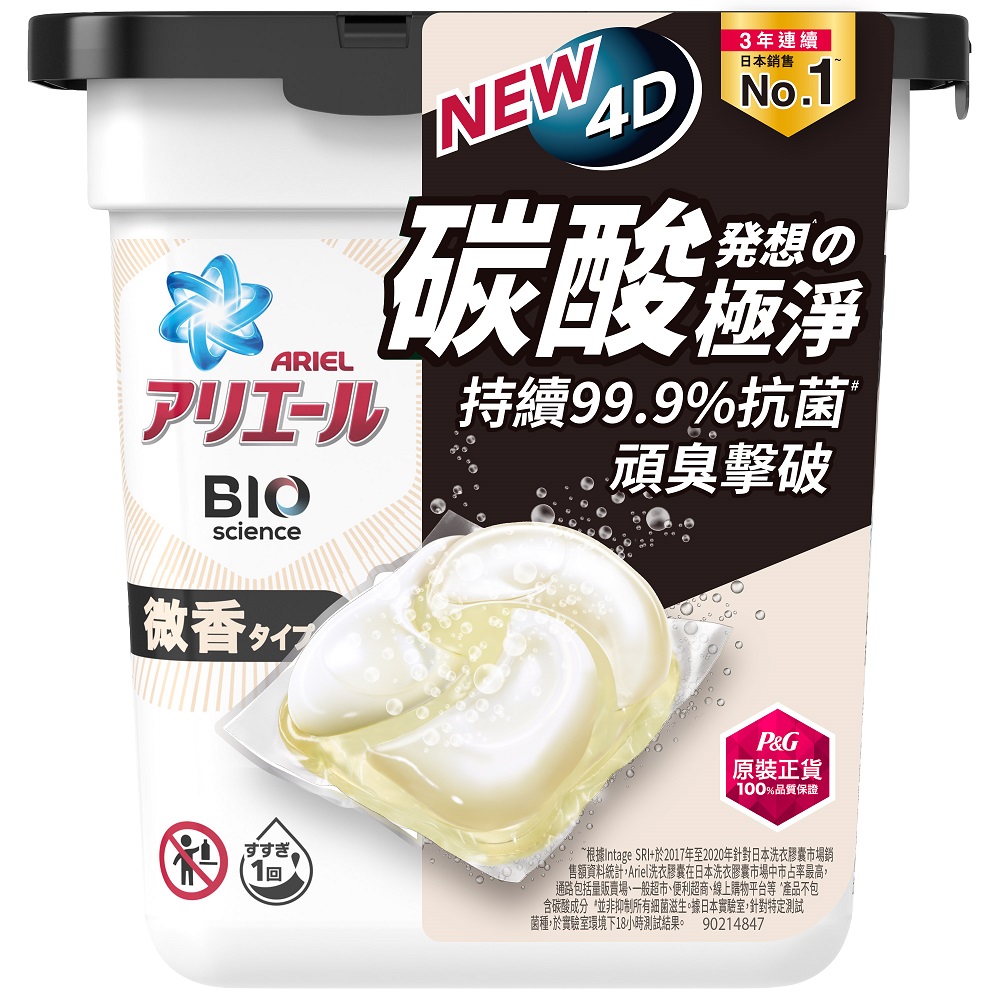 用過都會成為忠實主顧!!!一點都不誇張~ 就是這麼好用的洗衣膠球出新款嘍! 我們搶先上市👉🏻 日本最新款 P&G ARIEL 4D碳酸洗衣膠球 12入 全新4D碳酸功能 強力清潔的靈感源自小蘇打~ 史無前例的4層結構設計洗衣膠球 給你前所未有的淨白新體驗! 全自動洗衣機,滾筒式洗衣機OK 高效清潔洗淨100種的污垢 50倍的抗菌 也能徹底除臭還你清新香味